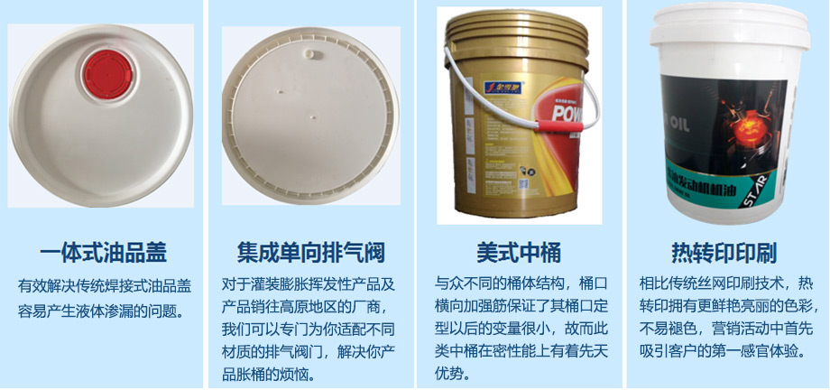 我們?yōu)榭蛻籼峁┡蛎浶砸后w的排氣解決方案,解決液體肥料膨脹問(wèn)題以及油品運(yùn)往高海拔地區(qū)時(shí)的桶內(nèi)壓力變化問(wèn)題;提供塑料制提手,握感更為舒適且承重能力大幅提高;一體式包圍油品蓋,解決傳統(tǒng)焊接小蓋滲漏問(wèn)題;配套為客戶提供桶身絲網(wǎng)印刷及更為高檔的熱轉(zhuǎn)印印刷方案。